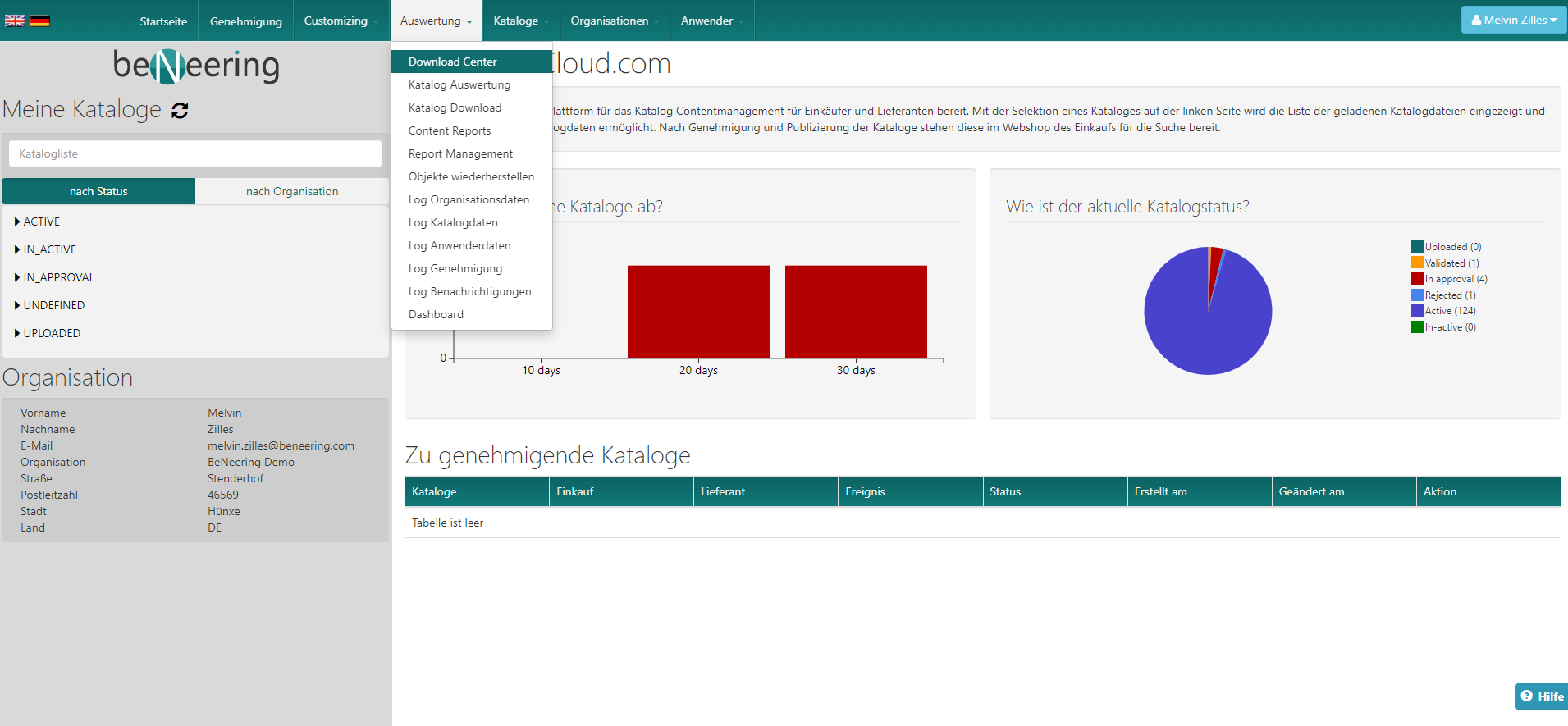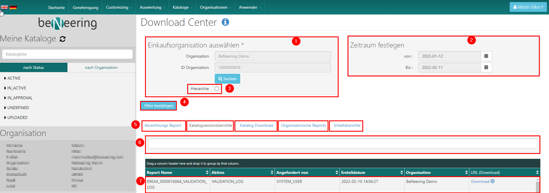 Dieser Artikel beschreibt die Registerkarte Download Center, über die Berichte in myCatalogCloud heruntergeladen werden können.