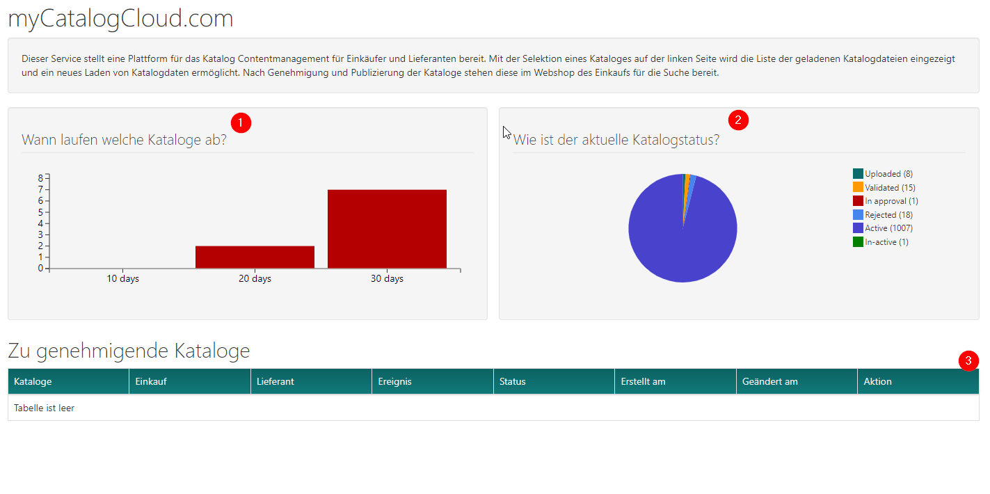 Direkt nach dem Login gibt das Dashboard wichtige Informationen zu den verwendeten Katalogen.