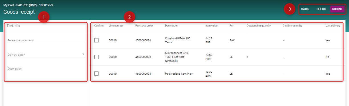 Nach dem Klick auf diesen Punkt öffnet sich ein neues Fenster. Es besteht aus einem Detailbereich (1), einer Liste der Bestellungen (2) und den Abschlussaktionen (3).