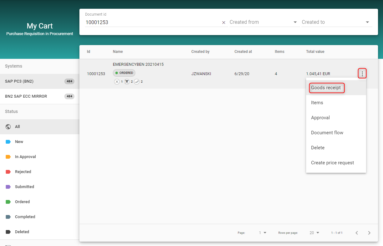 Sie können den Wareneingang über die MyCart-Liste aufrufen, indem Sie auf die drei Punkte auf der rechten Seite einer Bestellanforderung klicken. Dort finden Sie den Punkt „Wareneingang“.