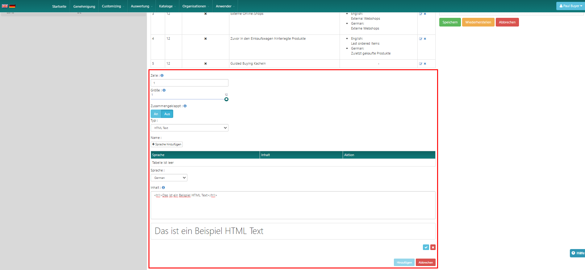 Wählen Sie als Typ "HTML-Text", wählen Sie die Sprache für den Namen, geben Sie einen Namen ein und klicken Sie auf das Pluszeichen unter der grünen Tabelle.
