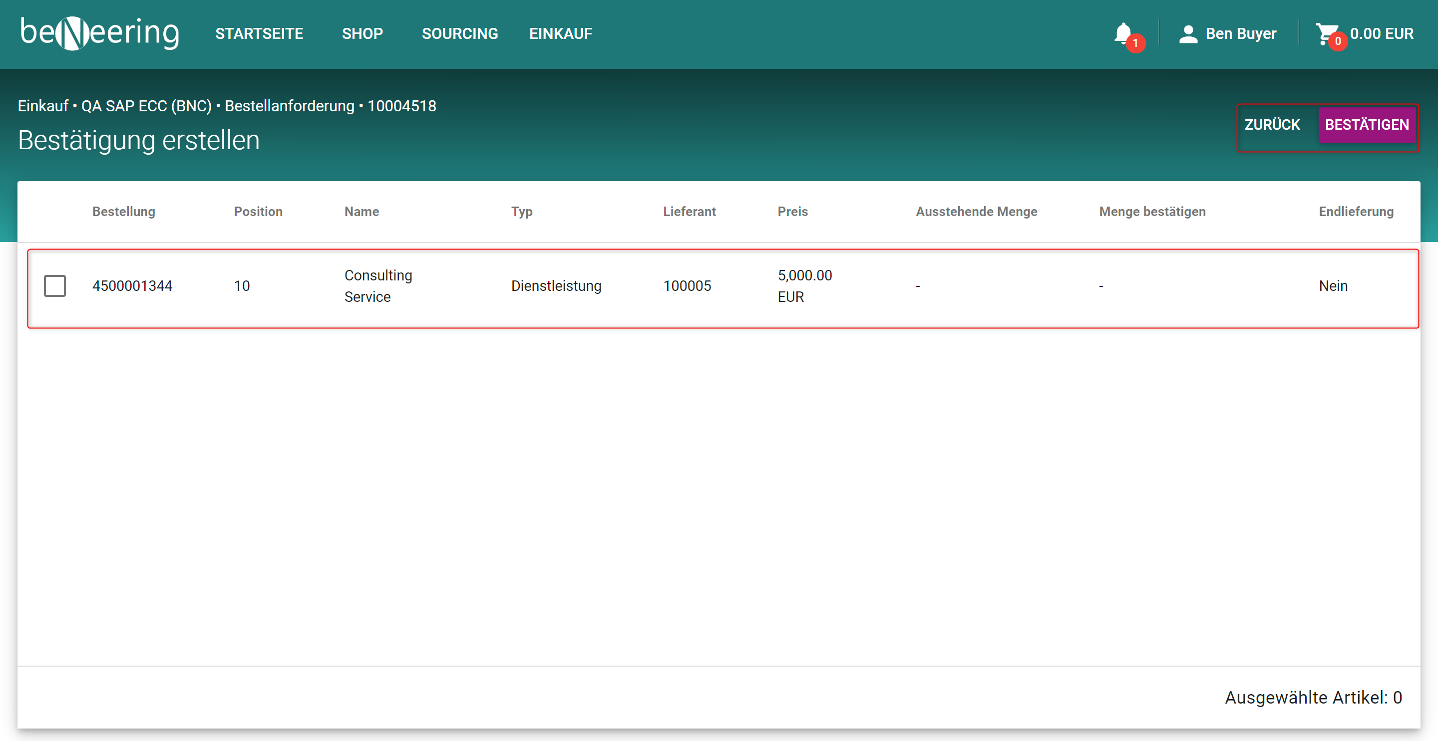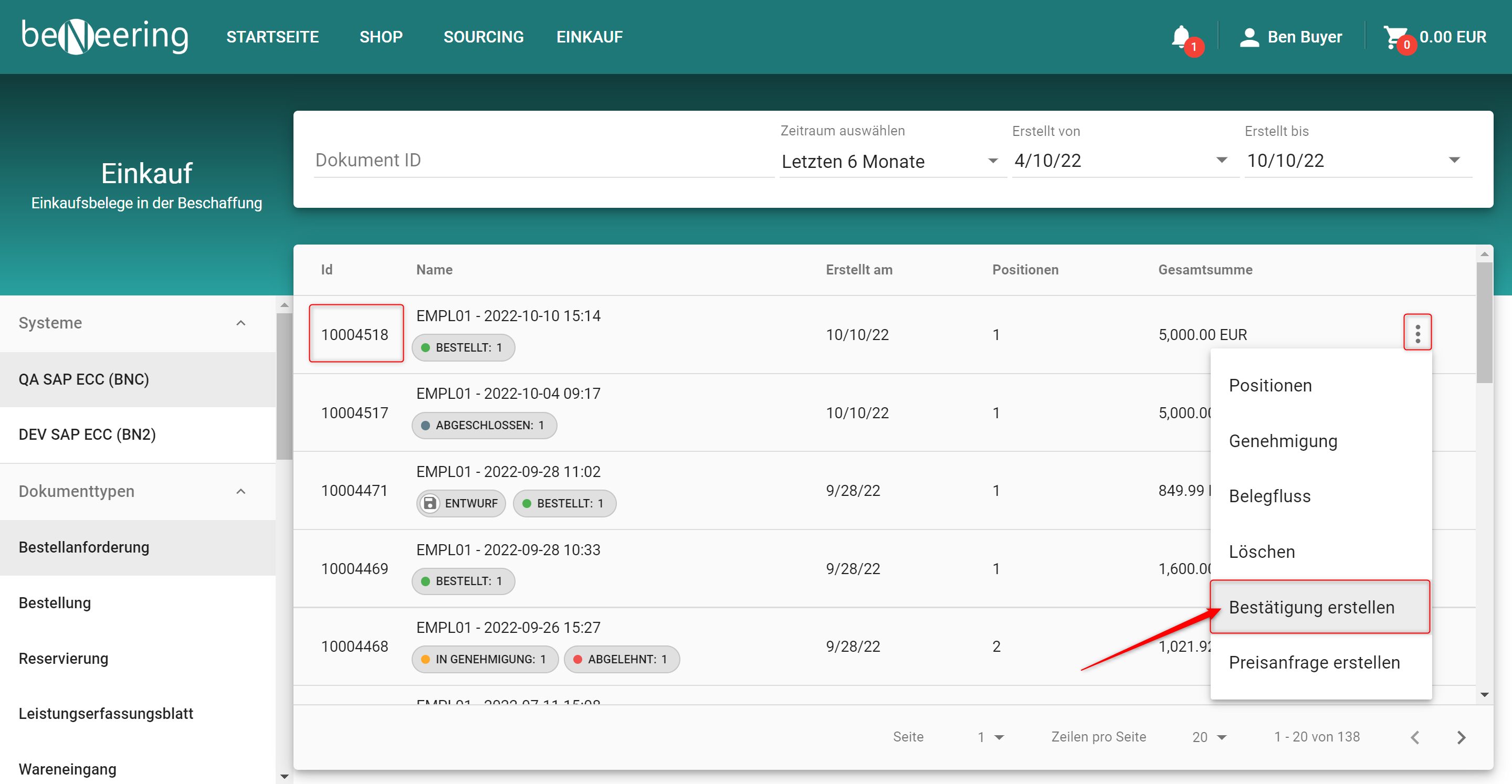 1. Zur Leistungserfassung gelangen Sie über die MyCart-Liste über die drei Punkte auf der rechten Seite einer Bestellanforderung. Dort finden Sie den Punkt „Bestätigung erstellen“.