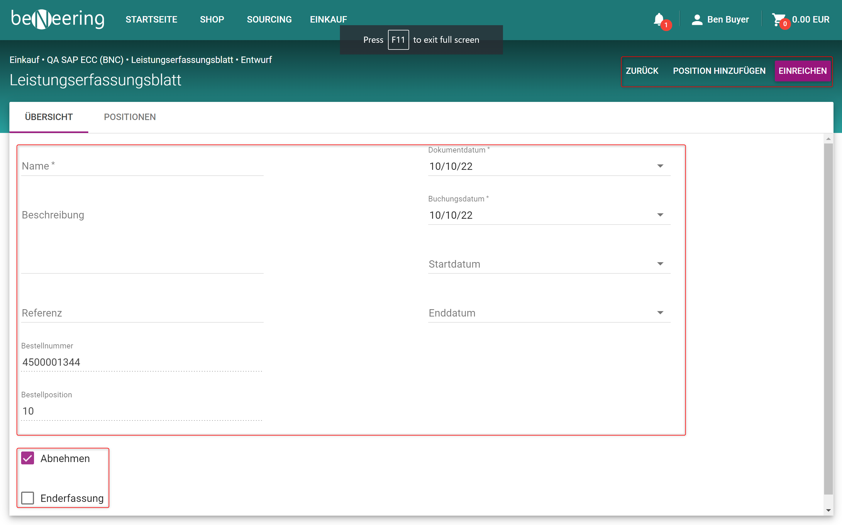 Danach können Sie auf EINREICHEN klicken, um die Leistungserfassung einzureichen.