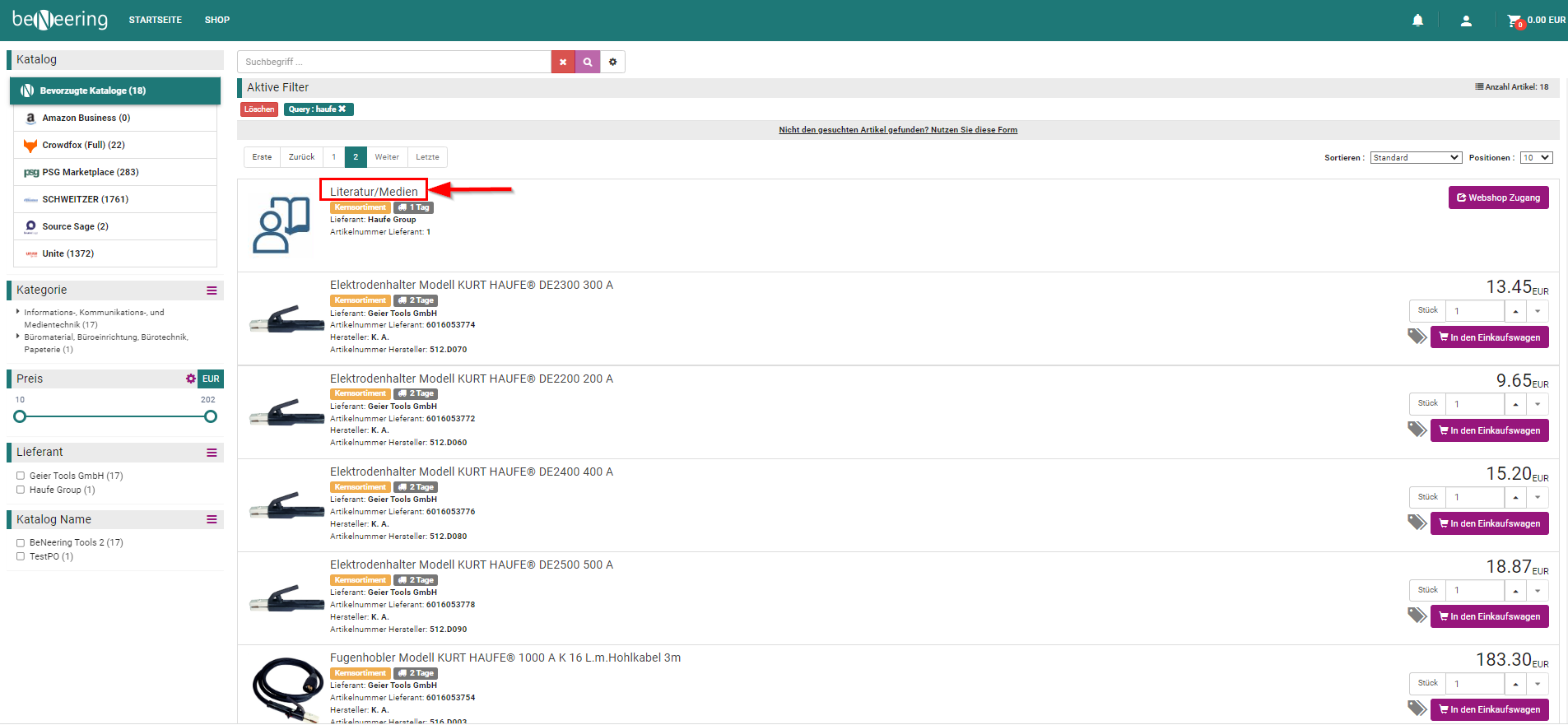 Suchen Sie den Punchout und klicken Sie auf den Namen des Artikels.