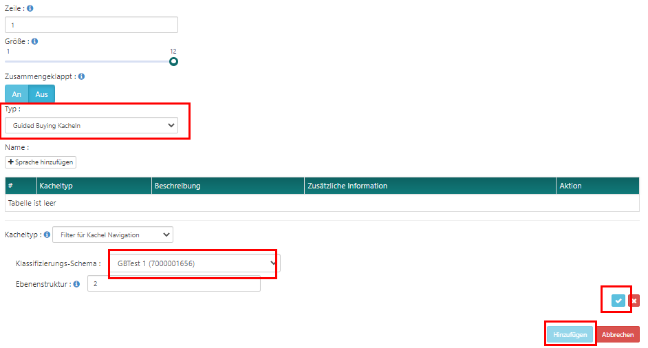 Erstellen Sie ein Widget vom Typ „Guided Buying Kacheln“ und mit der Aktion „Filter für Kachel Navigation“. Dort können Sie die zuletzt hochgeladene Guided-Buying-Datei als Klassifizierung auswählen (hier beschrieben: Guided-Buying-Klassifizierungsdatei).