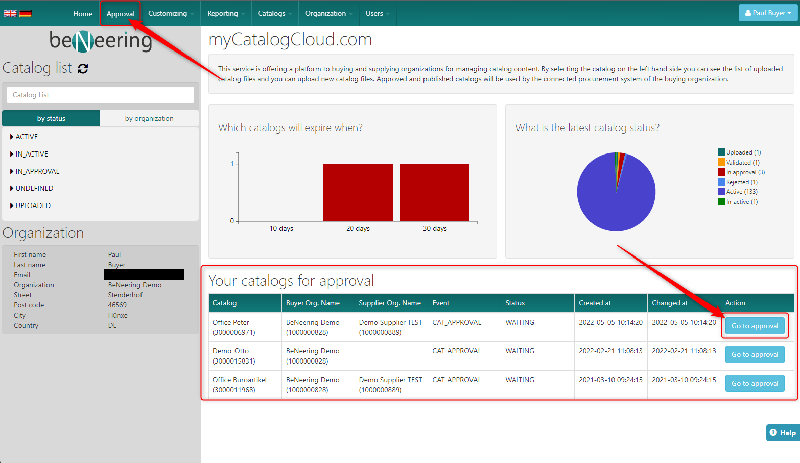 Mit der Freigabe können Sie die vom Lieferanten hochgeladenen Katalogdateien überprüfen. Nachdem der Lieferant einen gültigen Katalog hochgeladen hat, werden Sie benachrichtigt, diesen Katalog zu genehmigen.
