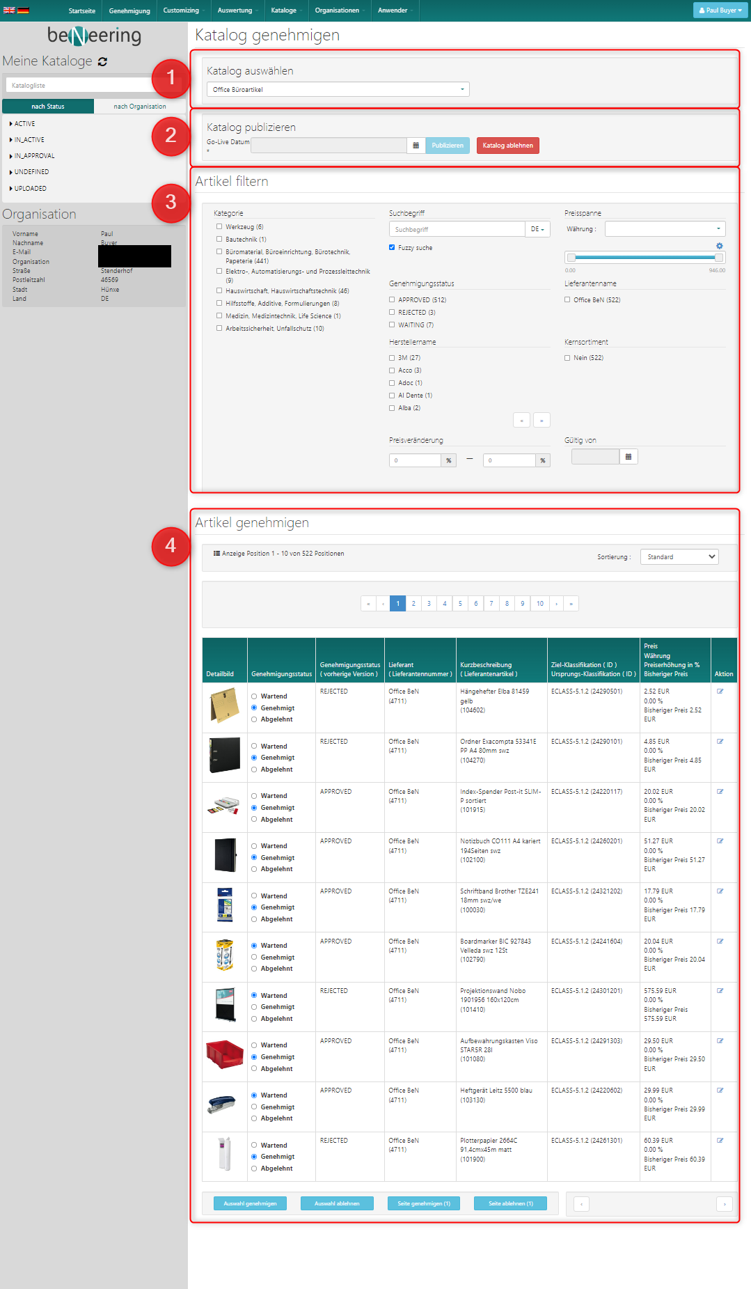 Hier sehen Sie alle Kataloge, die sich in der Genehmigung befinden, auf der Übersichtsseite.