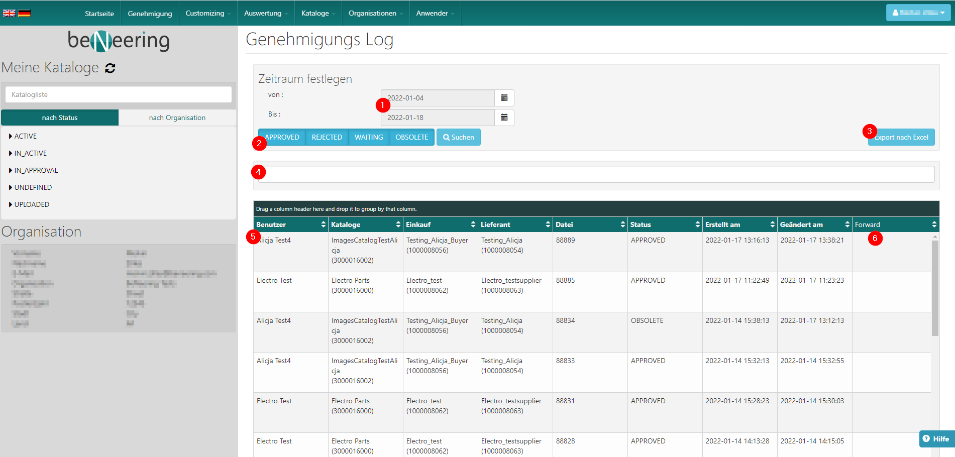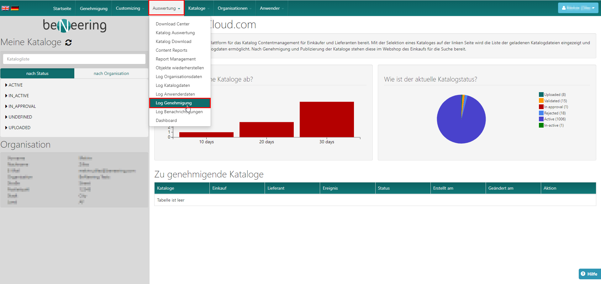 Die LOG Genehmigung gibt eine Übersicht darüber, welche Cataloge von wem genehmigt wurden.