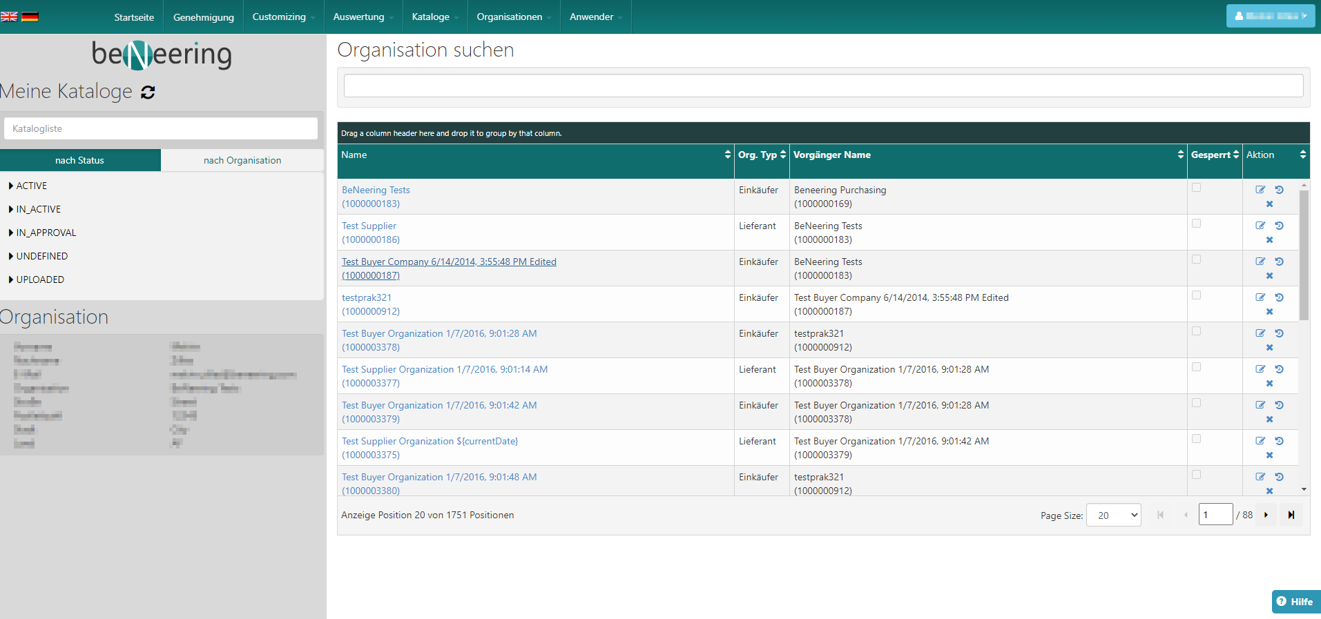 Aktion | Aktions-Button um zu bearbeiten, History der Organisation sehen Organisation löschen |
