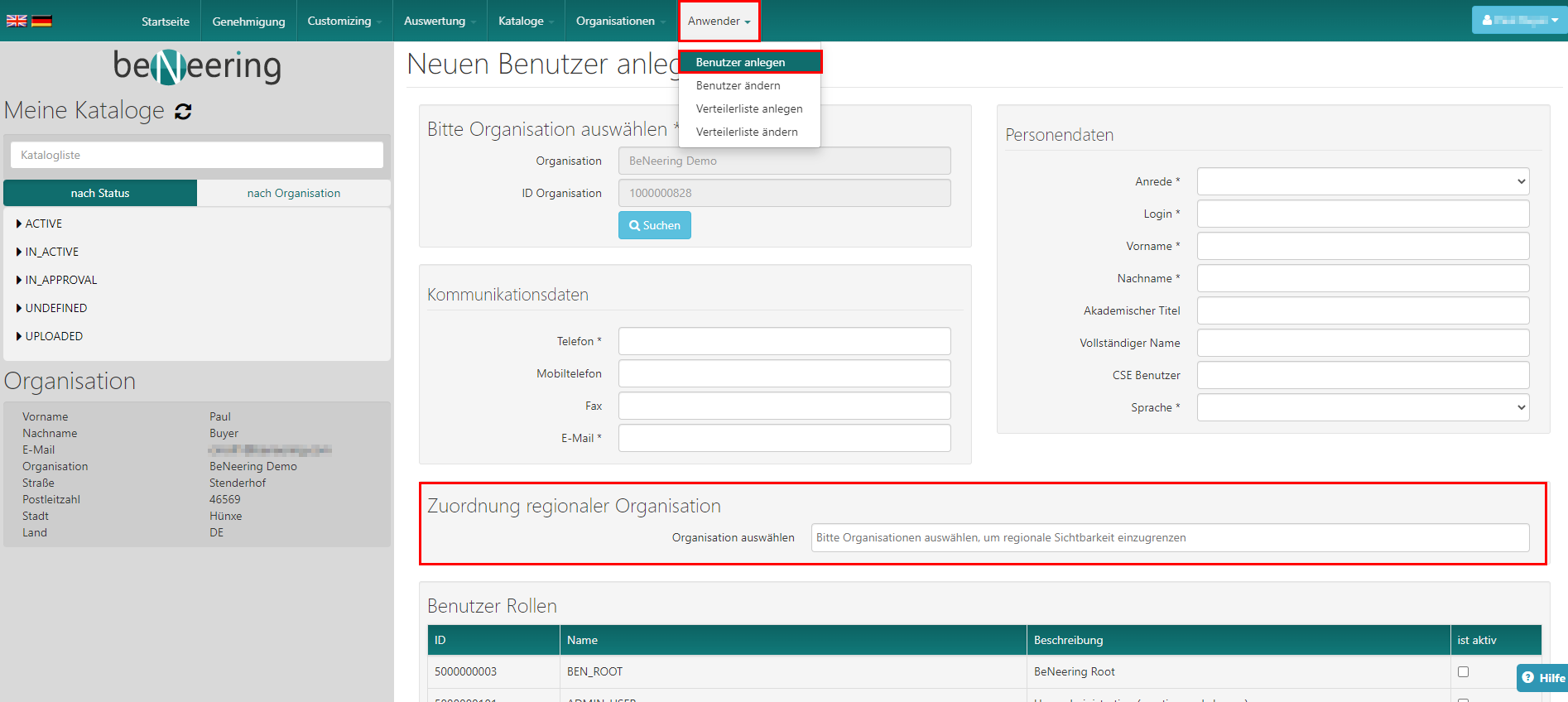 Nach der Auswahl der Organisation hat der Benutzer, auch wenn er sich in einer höheren Hierarchie befindet, nur Zugriff auf den Katalogcontainer der Organisation, der er zugeordnet ist.