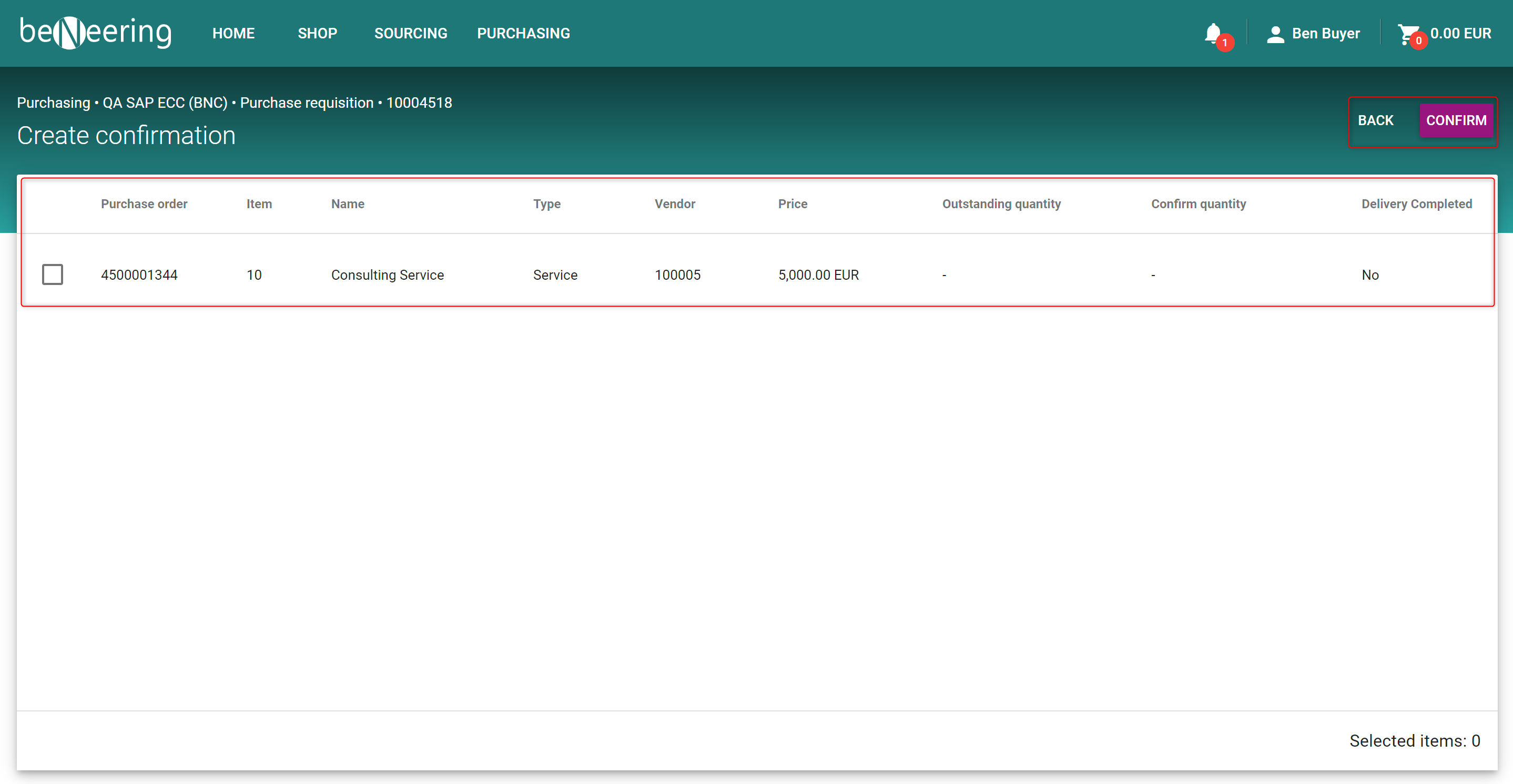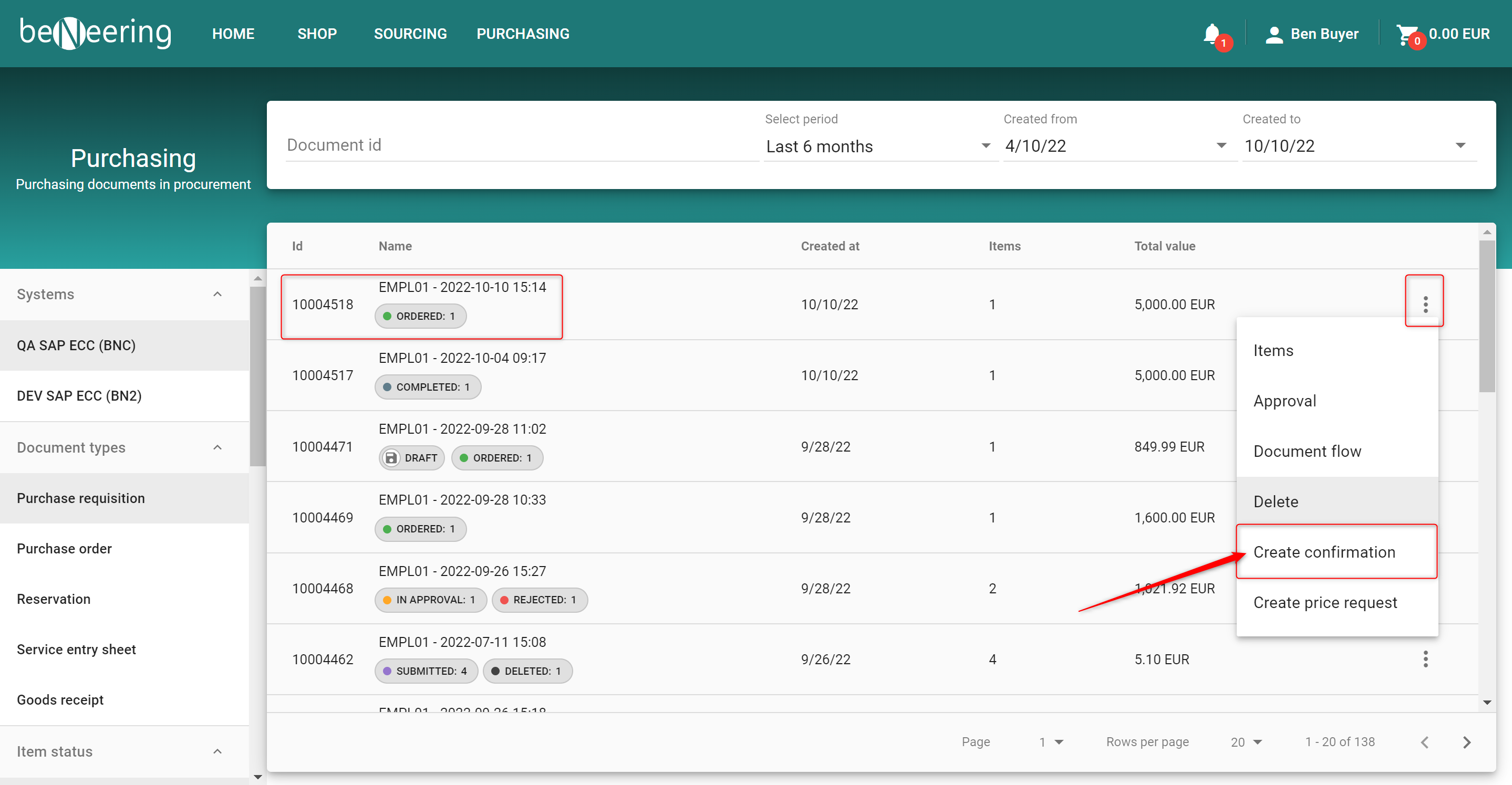 1. You can access a creation of a Service Confirmation via the MyCart list via the three points on the right side of a purchase requisition. There you will find the point "Create confirmation".