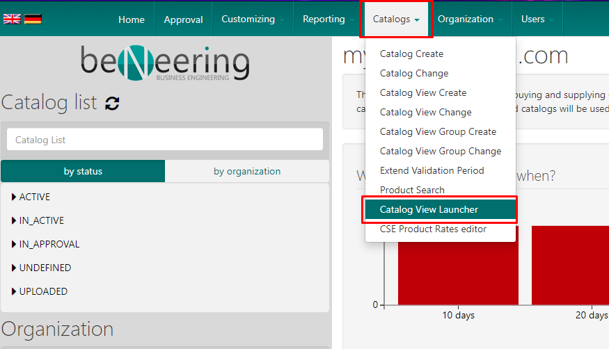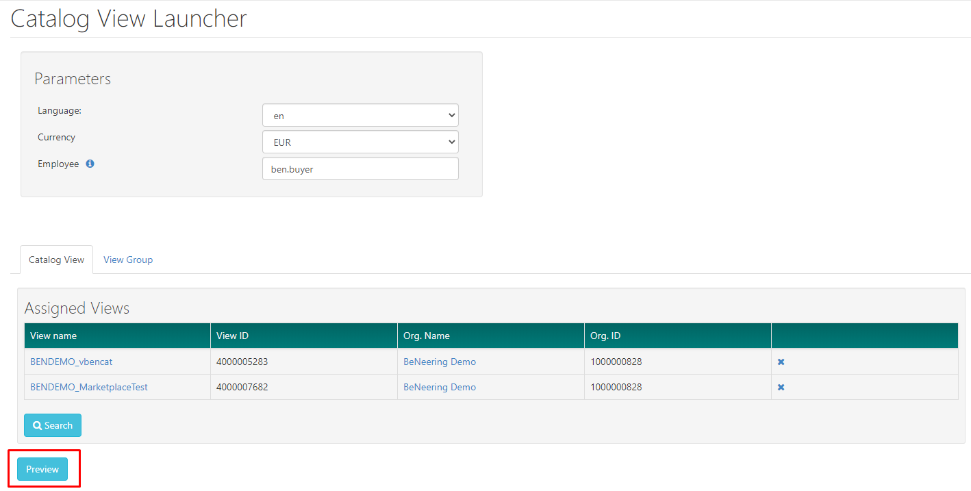 On the new screen you can now set up initial parameters like language, currency and employee. At the bottom of the page is the view or view group selection. Press on the search button and select the view(s) that should be displayed in the preview. After everything is set up press the preview button to open the catalog search.