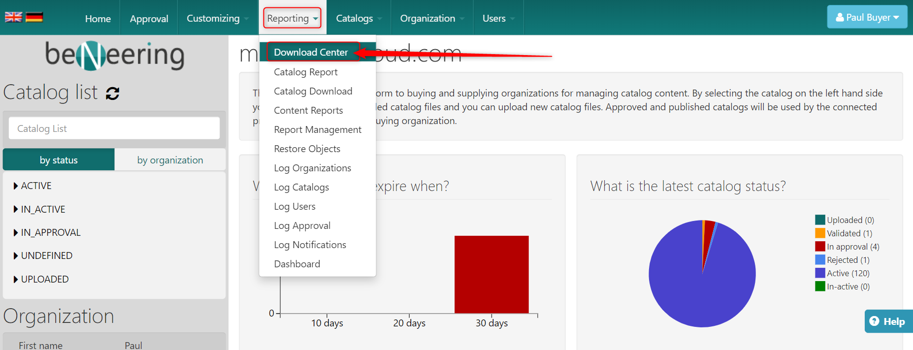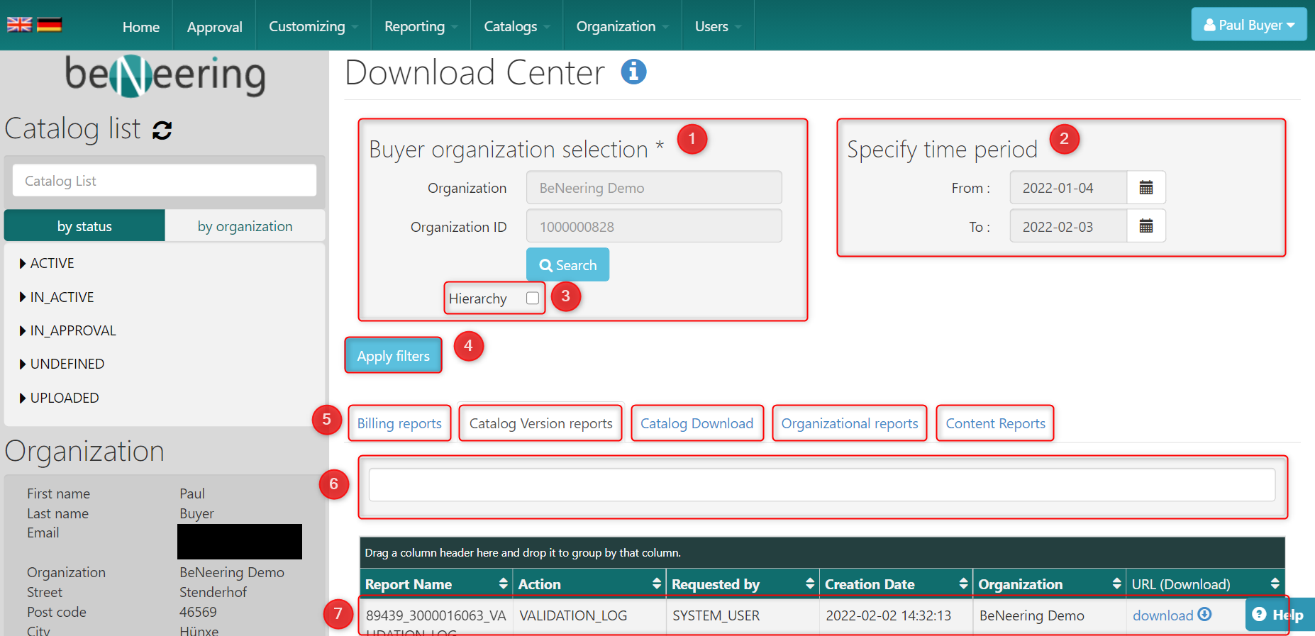 This article describes the Download Center from where reports can be downloaded in BeNeering Buyer App and myCatalogCloudServices.