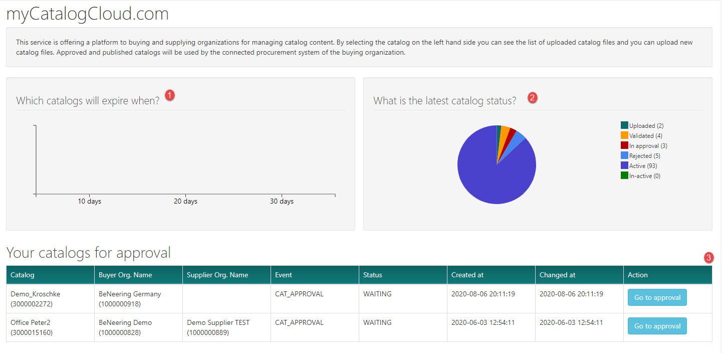 The dashboard provides a central overview of all catalogs in use, highlighting their status, validity, and any approval actions required.