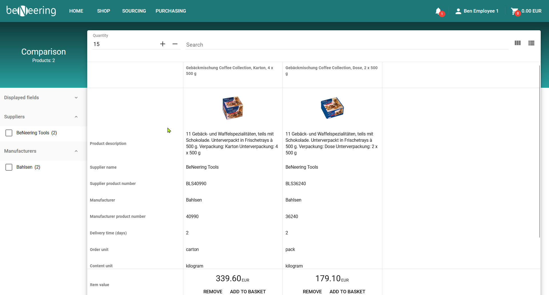 Search for standard and custom facets The search bar in BeNeering Guided Buying allows you to search not only by content, but also by standard facets (such as SupplierAID, ManufacturerName, etc.) and custom facets (such as GoGreen, etc.).