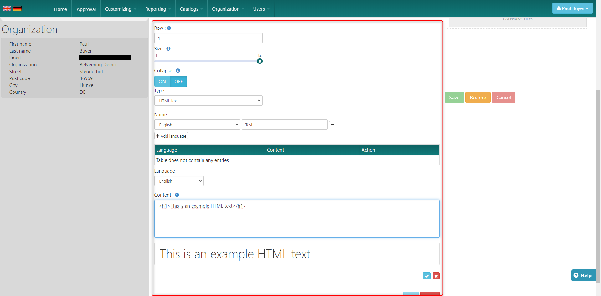 Choose the language for the text and enter your HTML text.