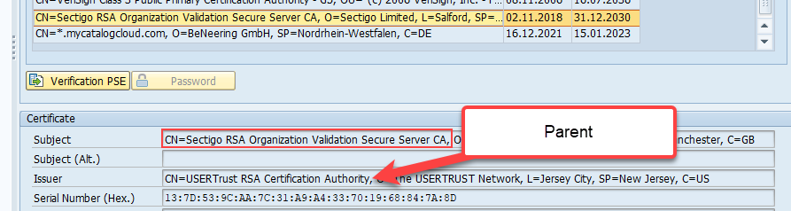 Remark: In SAP itself you can always see the parent certificate in STRUST like here: