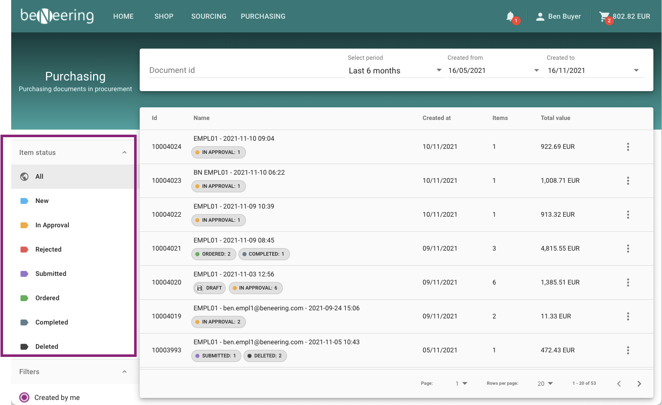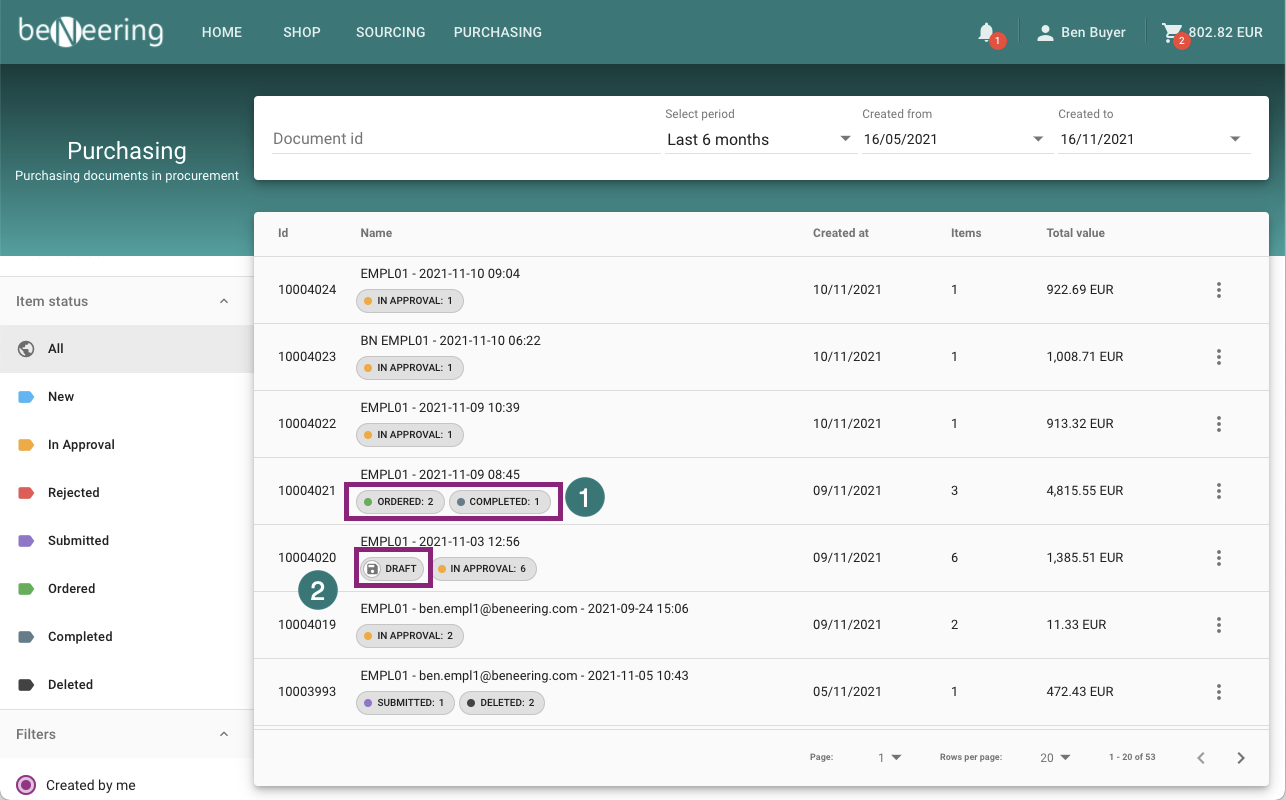 You can find statuses on the Purchase Requisition list and also an item status. Next to the MyCart you can find 1. item status with counter of items and 2. an indicator if it's a draft.